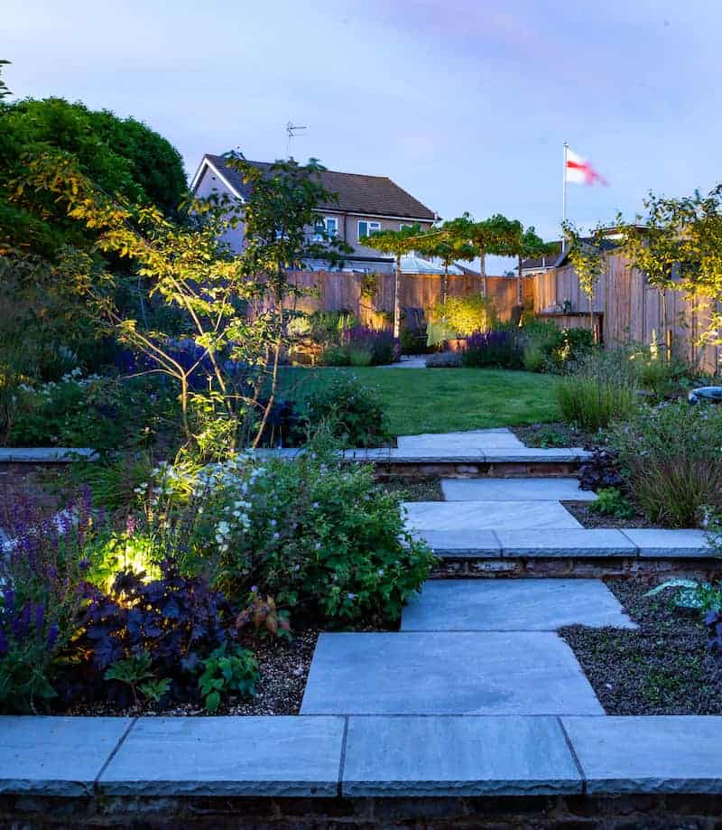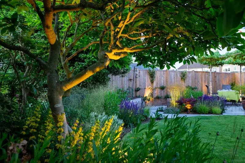 Don’t overlight your garden; otherwise, it will look too harsh. We recommend necessary lighting for the safety of steps, paths and entrances. Include sensor lighting for security. If you have an additional budget, use uplighters for crucial features in your garden. Uplighters can provide a good light source in a compact garden and can be used instead of path lights.