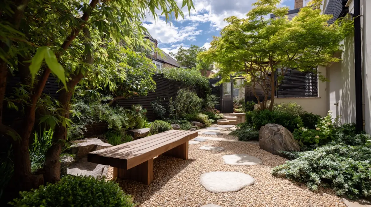 Planting is predominantly green, while the rocks and paths are light natural tones.