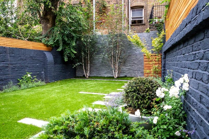 We installed a grass lawn to ensure the overall garden design was contemporary yet low maintenance for the clients. It looks vibrant against the backdrop of the Farrow and Ball painted garden wall.
