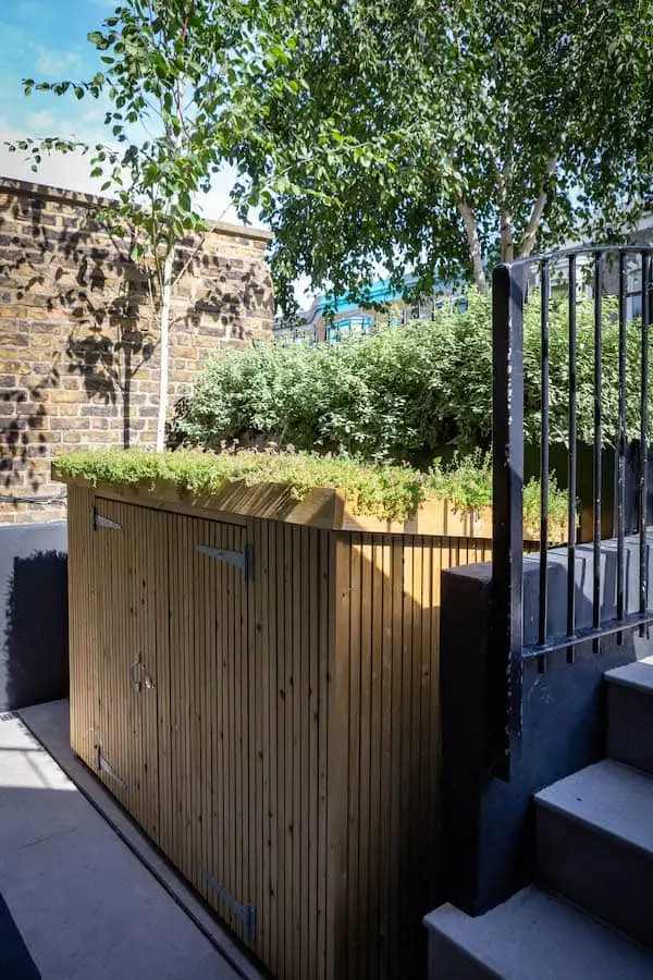 Acacia Gardens made a bespoke storage cupboard featuring a living roof. Painting the wood black to match the fence looks stunning. The storage sits outside the property’s back door for easy access and provides ample space for gardening tools and more.