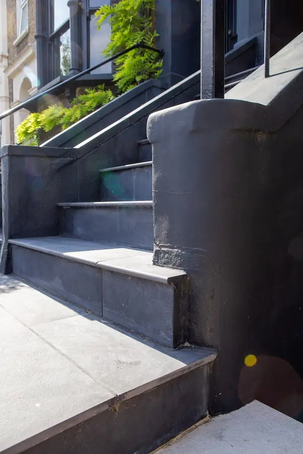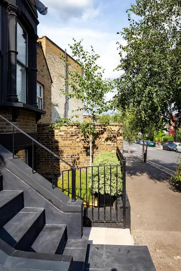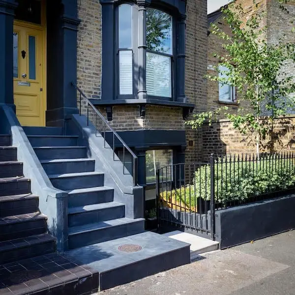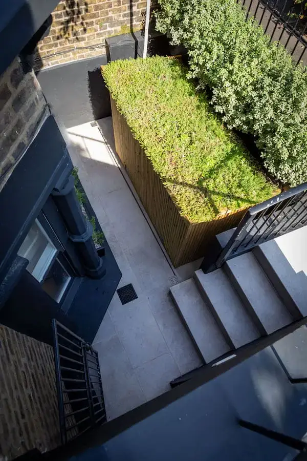 The project also included construction of the front garden. Florence Dark Porcelain step and riser installation gave the stairs a smart appearance. Drainage was an important consideration due to the steps leading to a basement level. Rendering the retainer wall and adding a green roof to the bike shed were additional interesting touches.