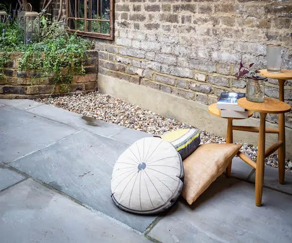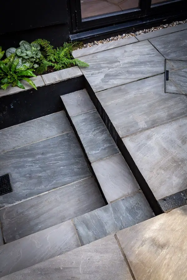 Acacia Gardens installed Khandler Sandstone paving to create two areas separated by granite setts. The main space was for a dining table, while the other included steps leading to a glass door to the rear of the property. We also inserted drainage slots in the paving.