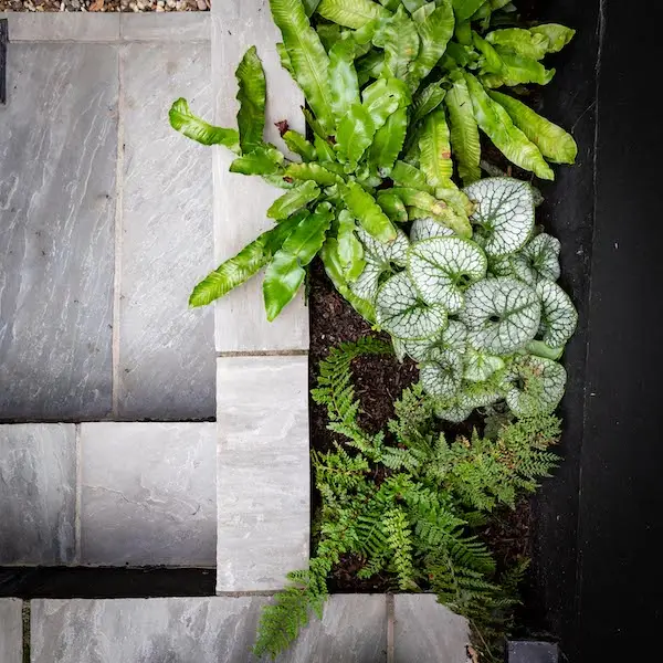 We built a brick wall raised bed to situate the perennials and additional planting, including ferns. Creating a seating area into the raised bed provides a spot to relax and a great place to position the dining table.