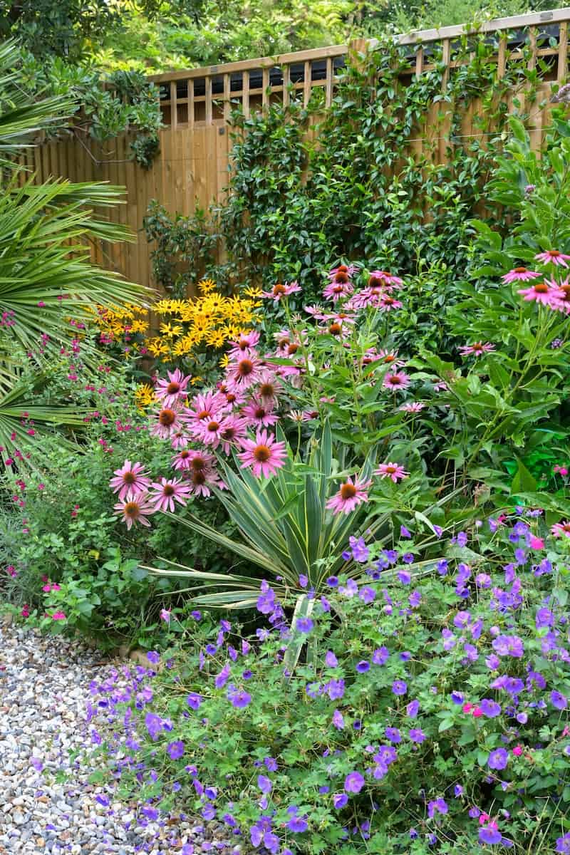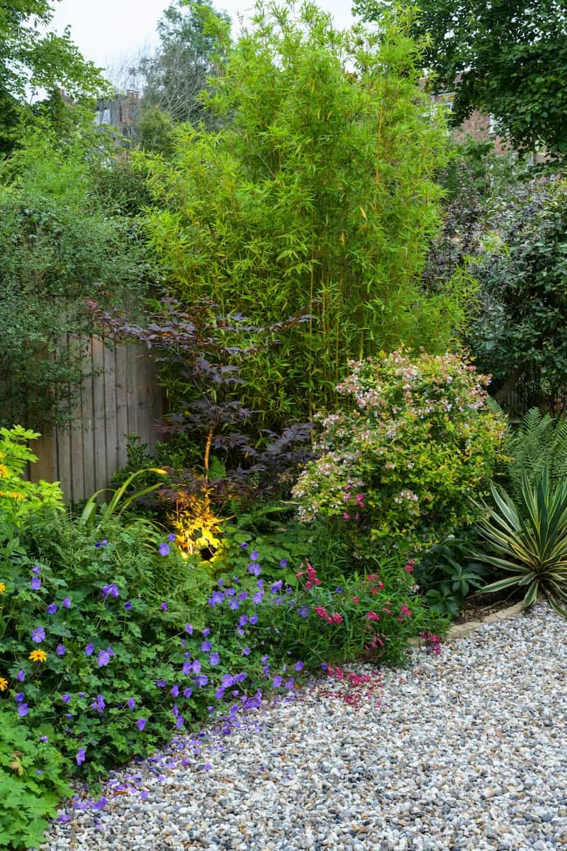 The garden showcased mature shrubs, notably a captivating Chamaerops Humilis visible from indoors. Seasonal herbaceous plants in pink, yellow, purple and autumnal reds were added for extra appeal. New focal points included Multistem trees: Acer Bloodgood, Amelamchier Lamarckii and Magnolia Stellata. The composition featured repeated triangular and round shapes with Salvia Caradonna and Echinops Bannaticus. At the same time, diverse textures came from Dryopteris Erythrosora, Pittosporum Elizabeth’s delicate leaves, and Molinia Caerulea grasses for contrast and interest.