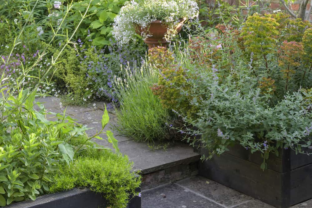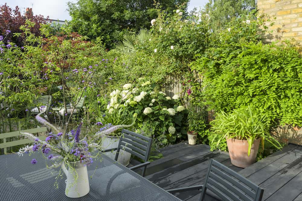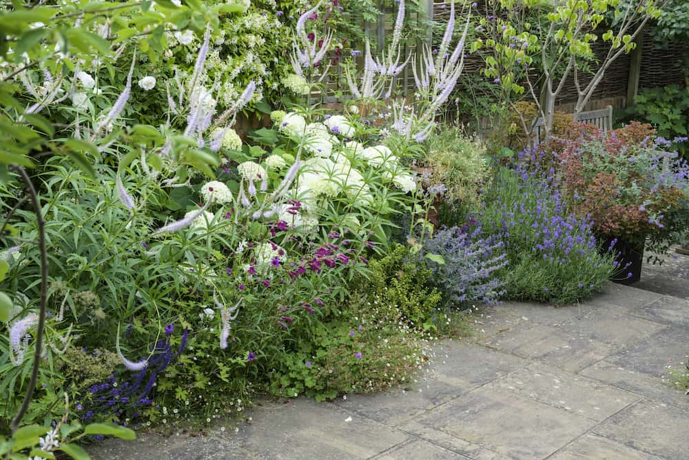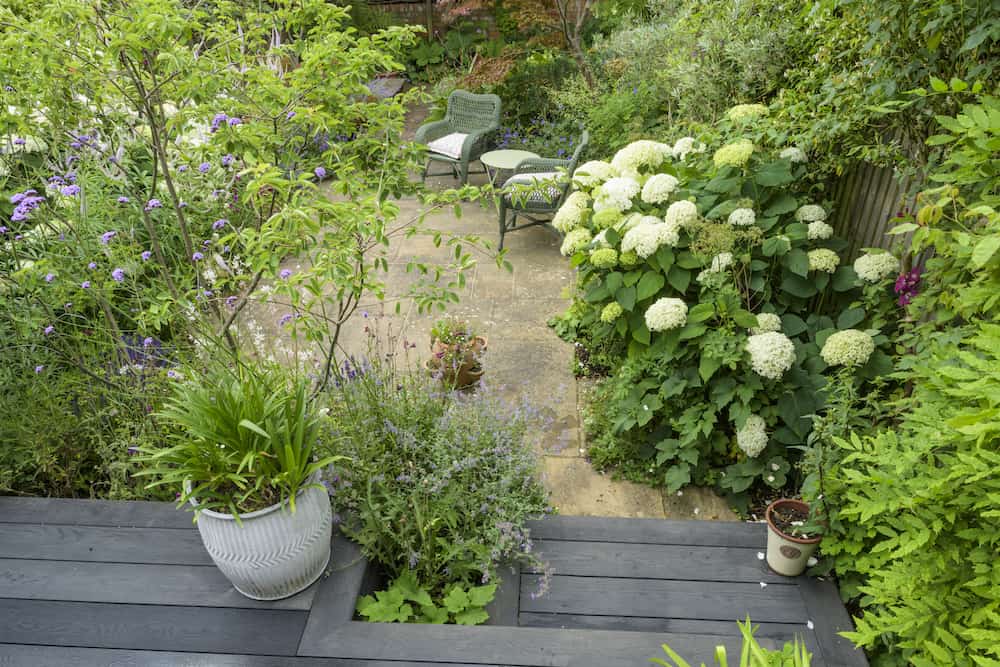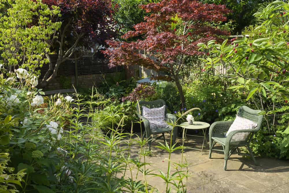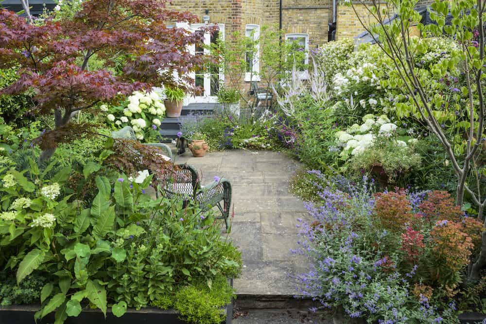 With a mix of trees, shrubs and flowers in the deep perimeter borders, the garden has a typical English country garden feel. We built an L-shaped raised bed with pressure-treated sleepers that were sanded and painted. An established Acer tree was kept, and other plants provided decorative interest.