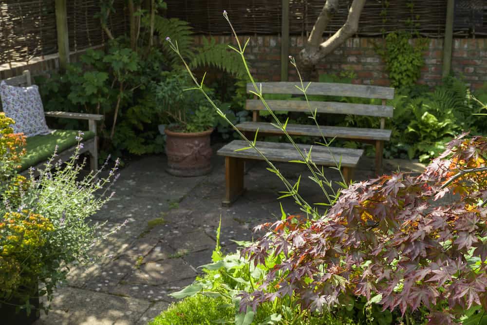 The decking steps connect with the paved patio area, which takes you to the rear of the garden, where you’ll find a bench to sit down and admire the house. Connecting the garden surfaces improves the ease of movement around the garden. By putting materials together the connecting surfaces appear seamless with a tidy finish.