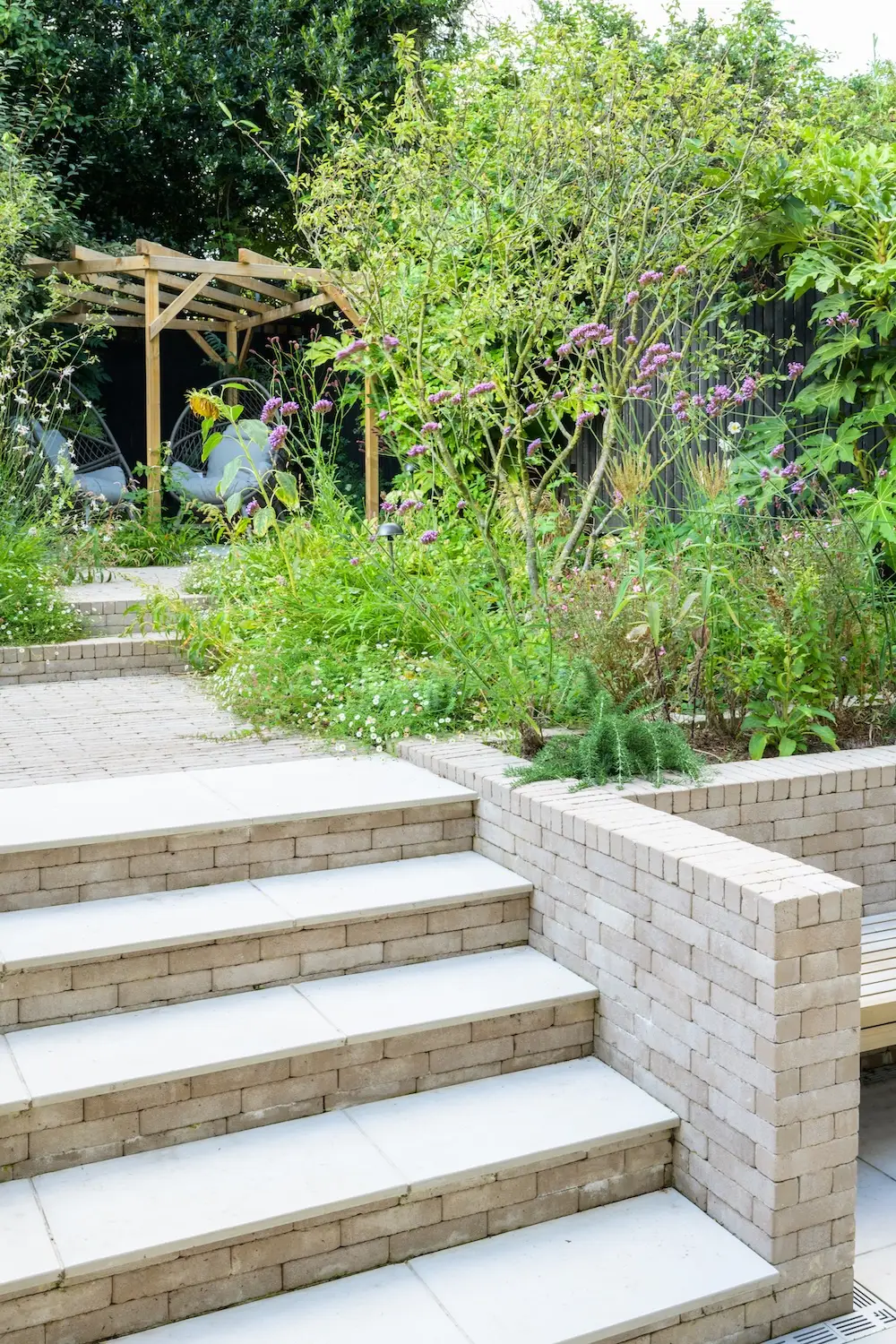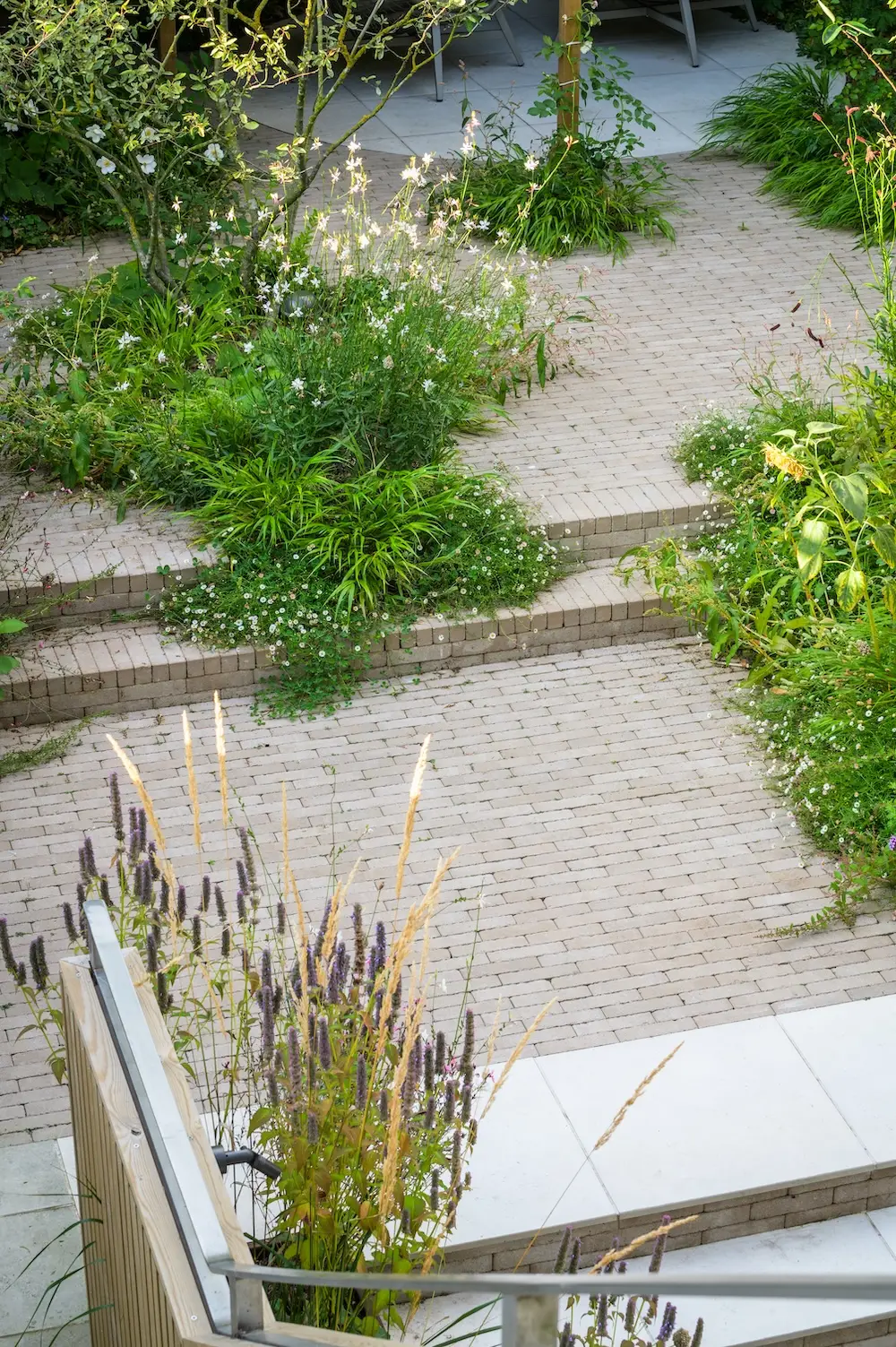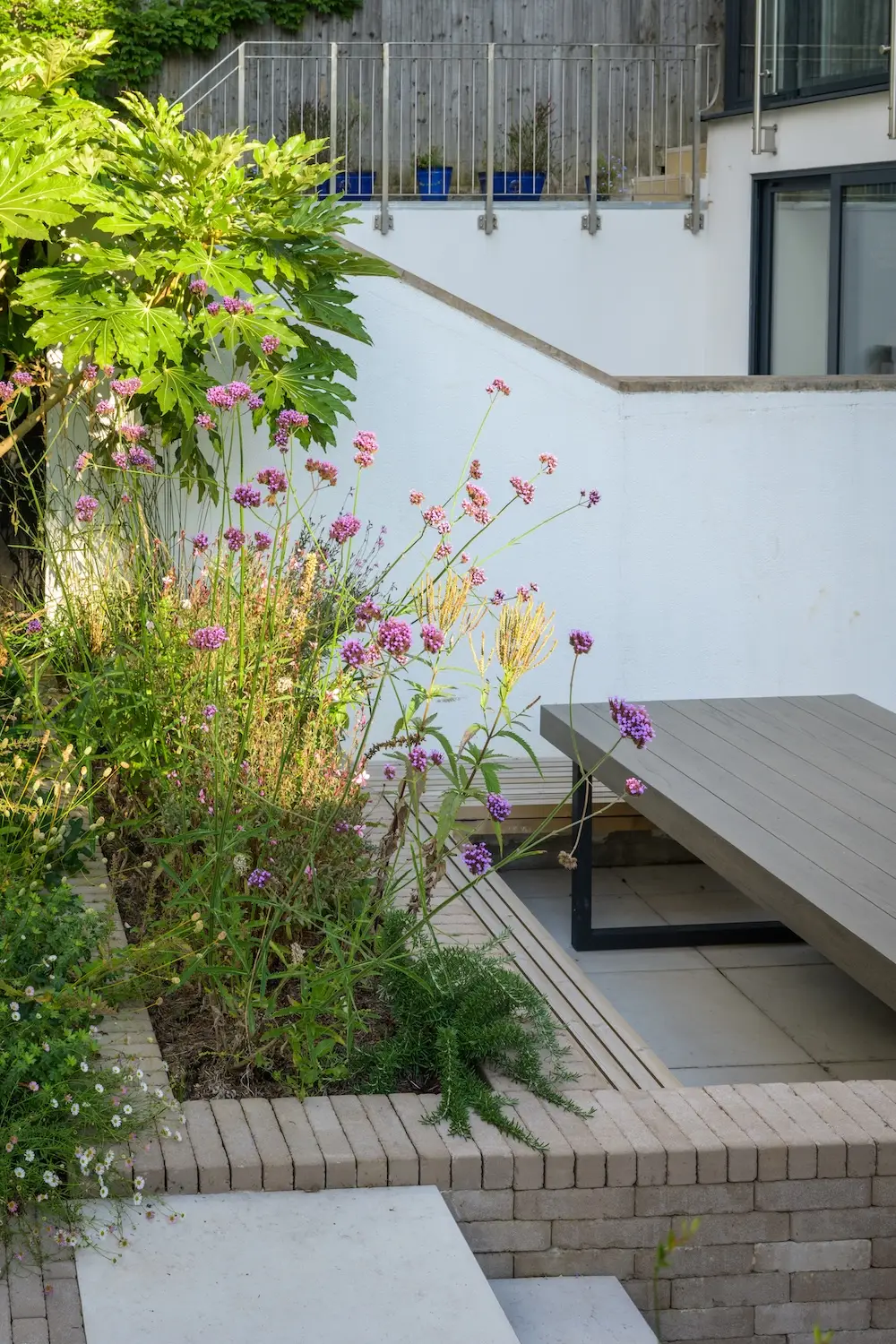 Just outside the house, a porcelain-paved patio sits, with robust steps leading to the rear garden. The steps incorporate the bricks used in the built-in bench, providing a cohesive and harmonious look. This thoughtful design detail helps unify the different areas of the garden.