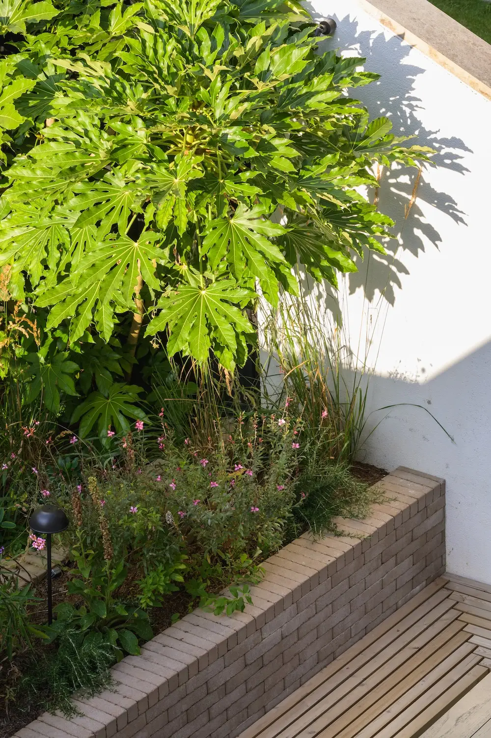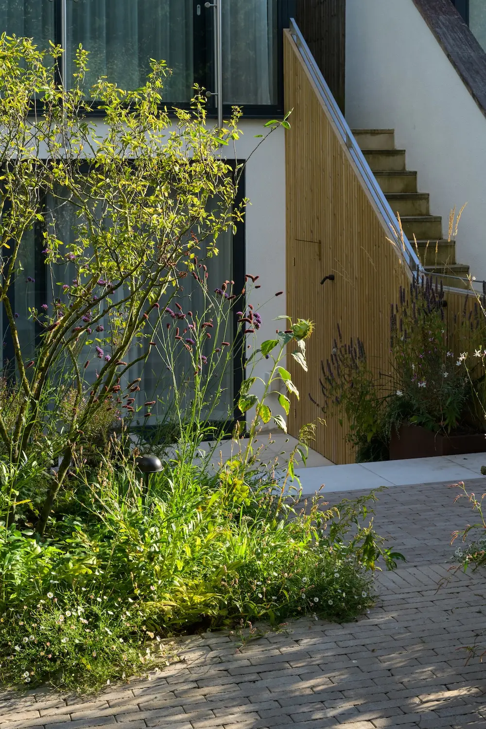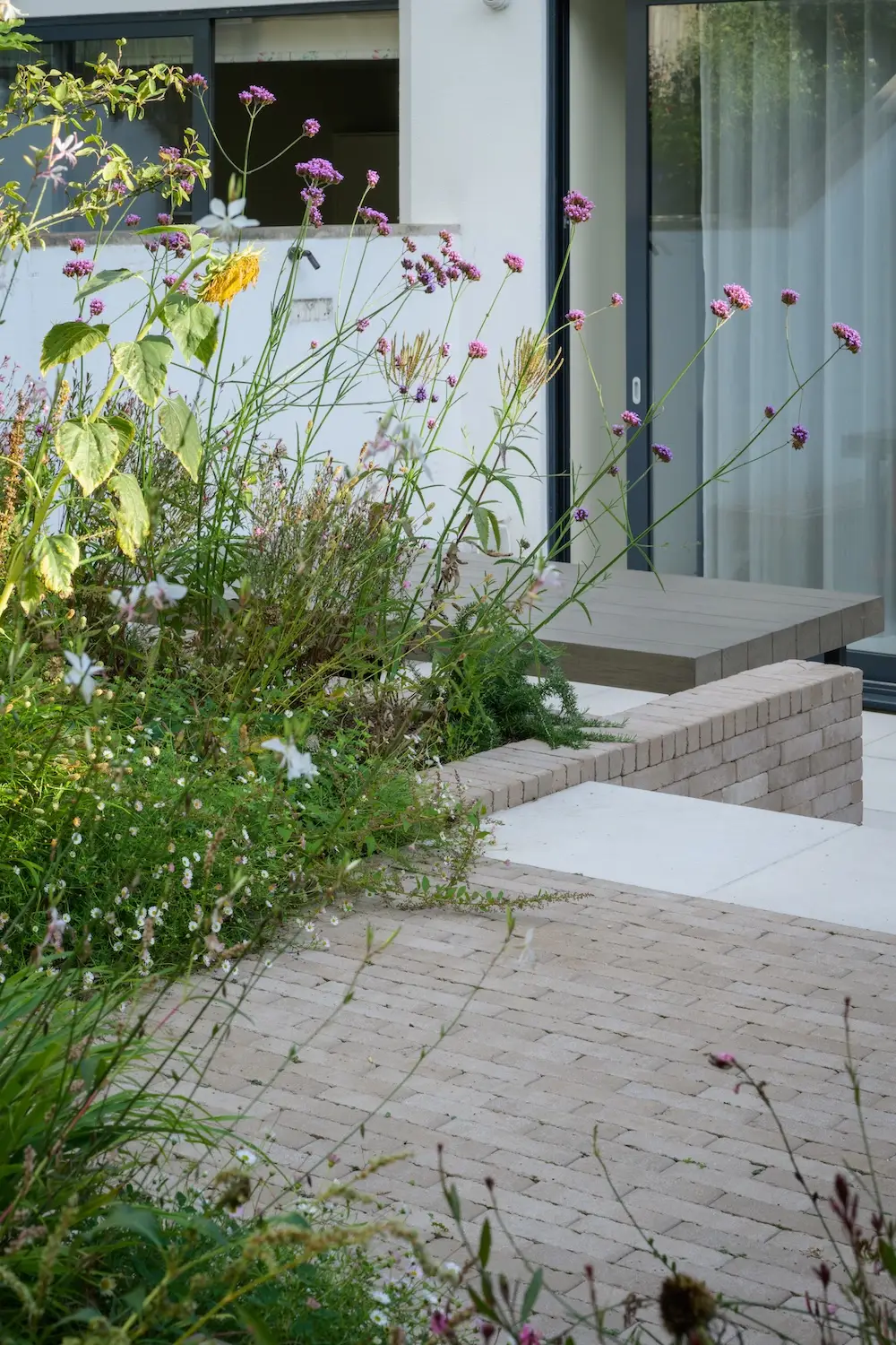 Just outside the house, a porcelain-paved patio sits, with robust steps leading to the rear garden. The steps incorporate the bricks used in the built-in bench, providing a cohesive and harmonious look. This thoughtful design detail helps unify the different areas of the garden.