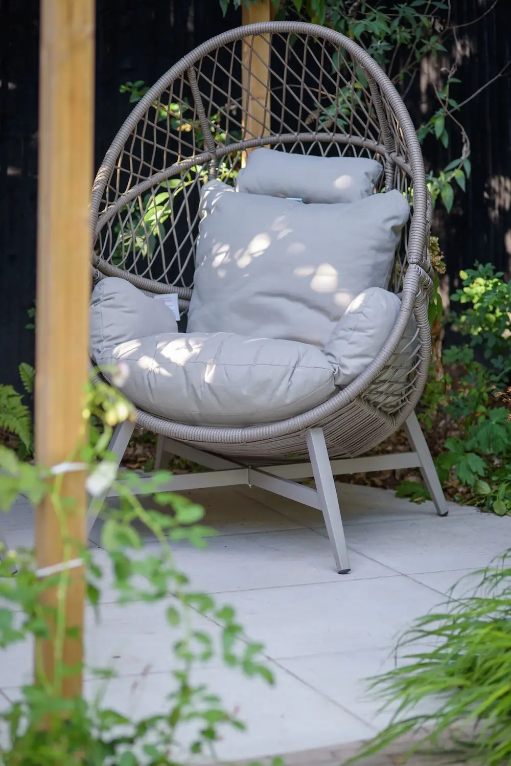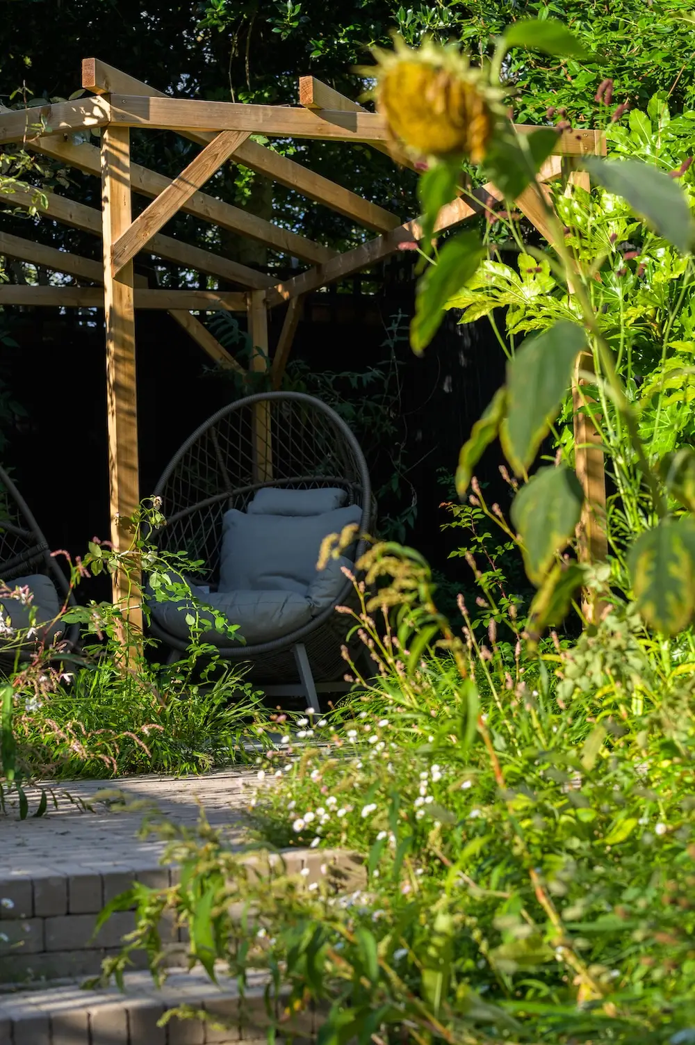At the far corner of the garden, a circular wooden pergola shelters a paved seating area. This tranquil spot offers a perfect relaxing place, with picturesque views back towards the house. The pergola adds height and character, creating a cosy, shaded retreat within the garden.