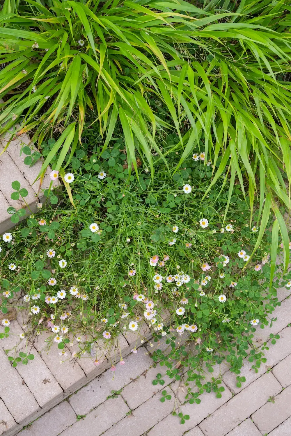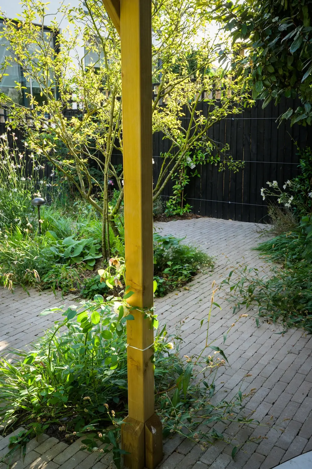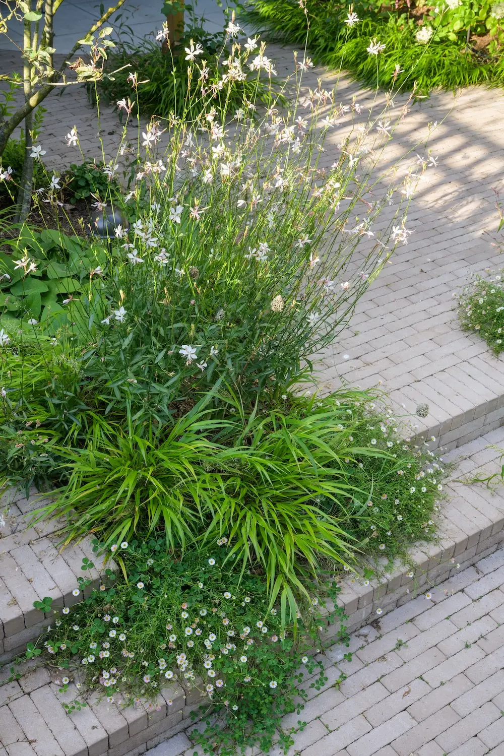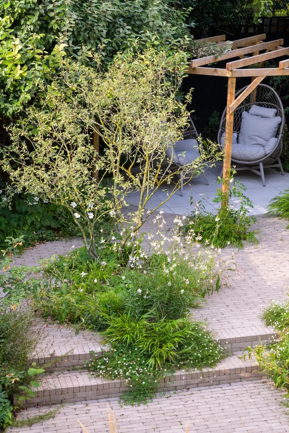 The garden’s central feature is a London Stone clay paver area, with staggered pathways leading to two intimate seating spots. The planting extends right to the edges, creating a natural spillover that softens and blends the hardscape with the lush surroundings.