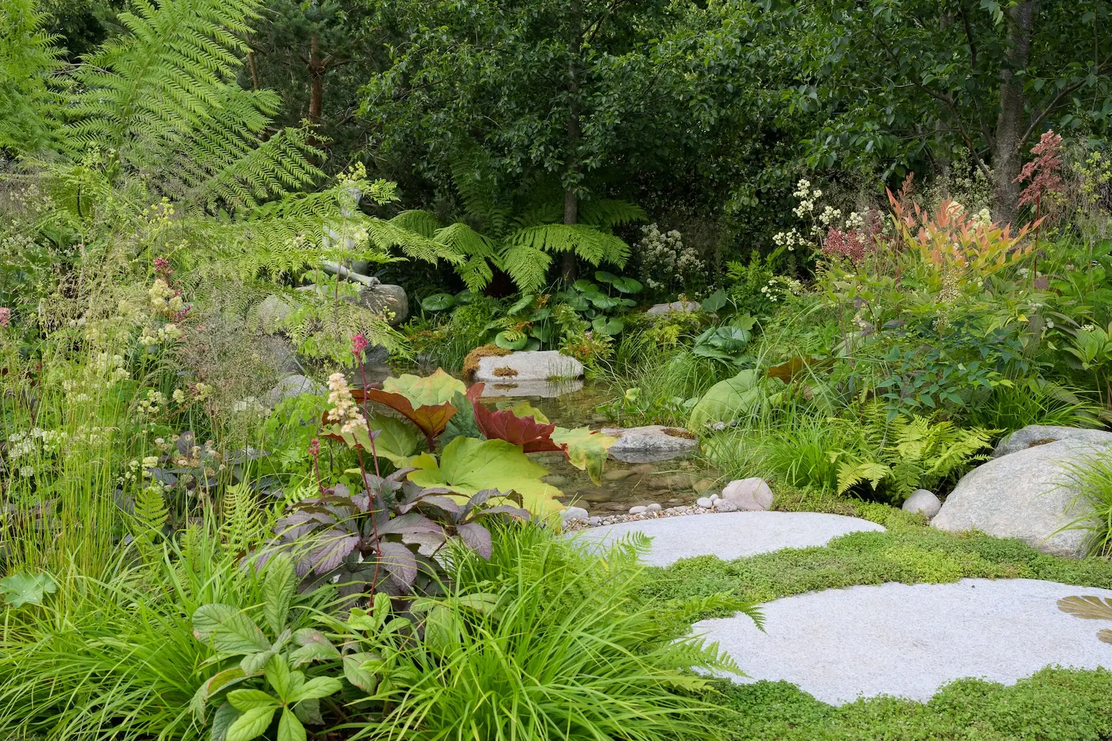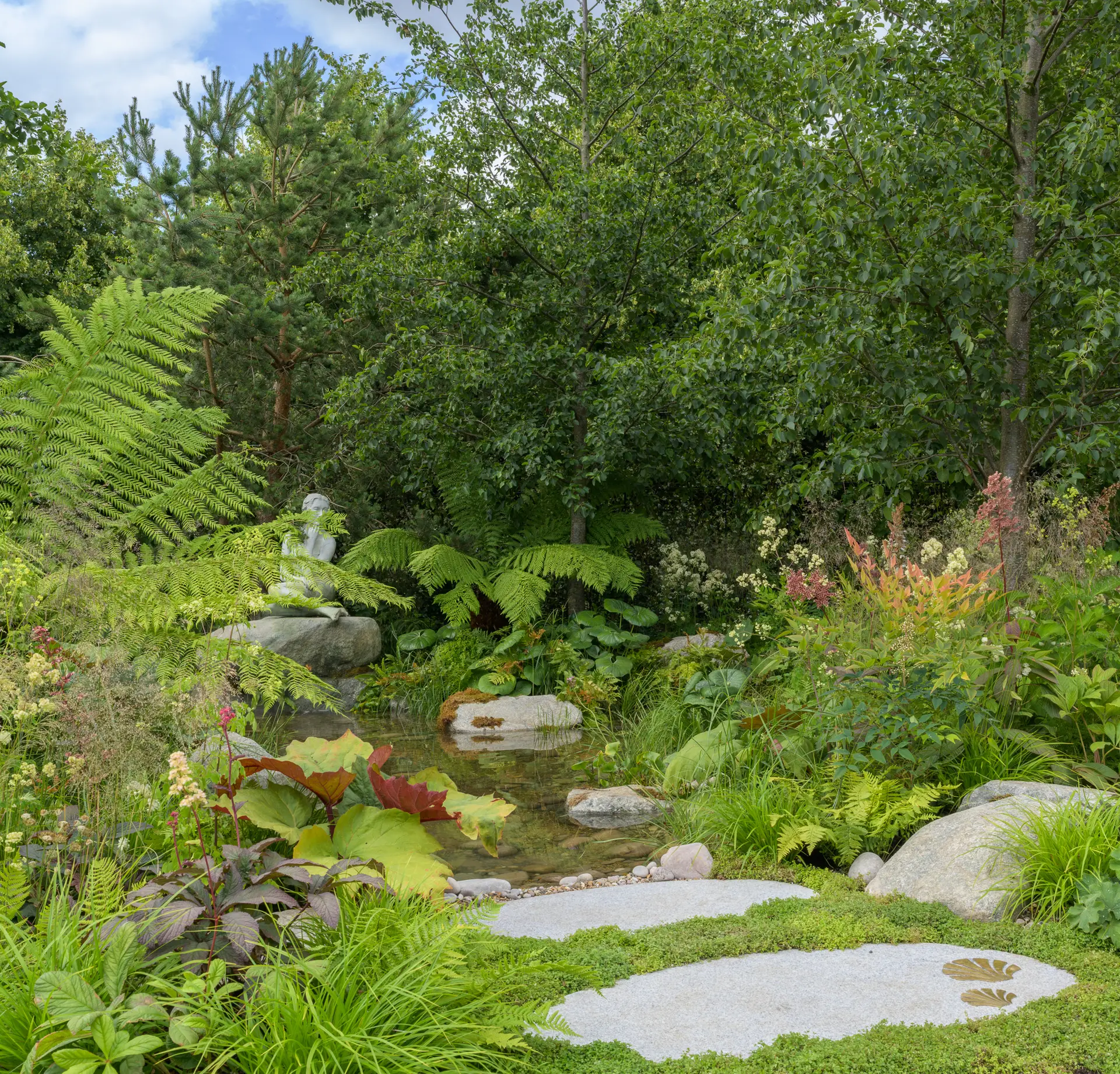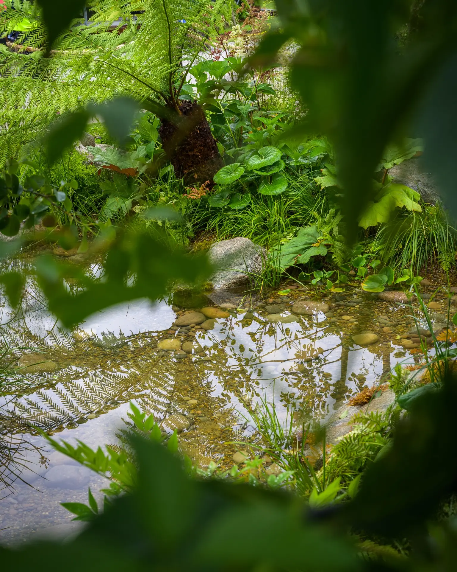 The show garden construction aimed to establish a mature look for the landscape foliage and planting. Simultaneously, with its carefully placed stones and rocks, the water feature was designed to appear natural, enhancing the garden’s relaxing and soothing appeal.