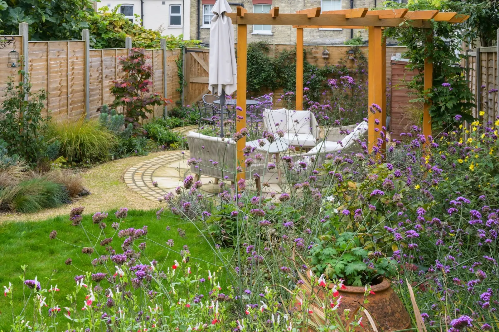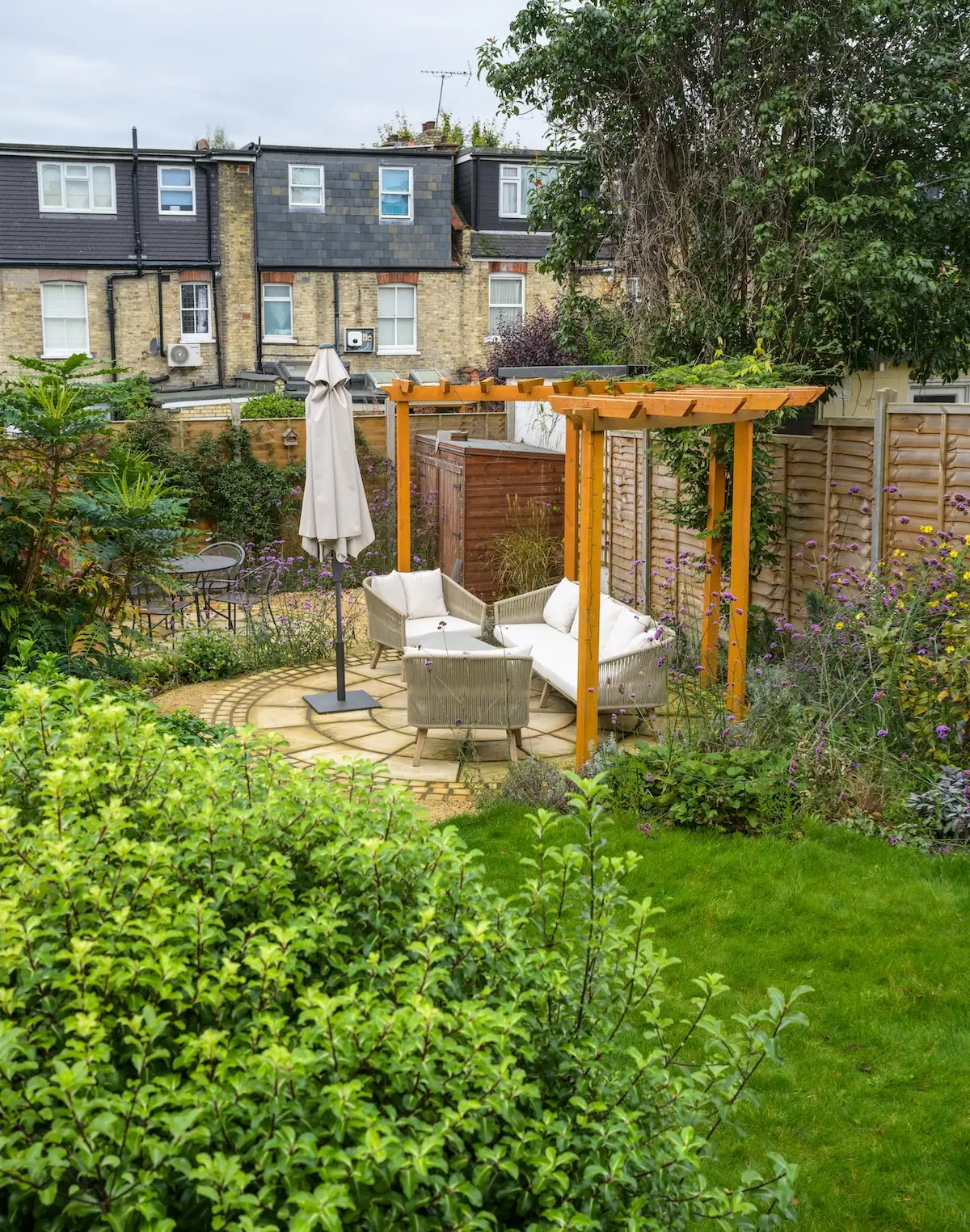 This delightful wildlife garden design and build project in Finchley, North London N3, has been transformed into a nature-attracting oasis. The Finchley garden upgrade combines a circular layout and curved paths to create a soft, harmonious design. Inspired by the natural contours of the lawn, it was expertly planned by our Garden Design team to attract wildlife. Inviting seating areas with golden fossil sandstone and a half-moon pergola complement the biodiversity-focused planting scheme, which supports pollinators, birds and ecological diversity. The result is a functional, wildlife-friendly retreat that encourages relaxation and exploration.