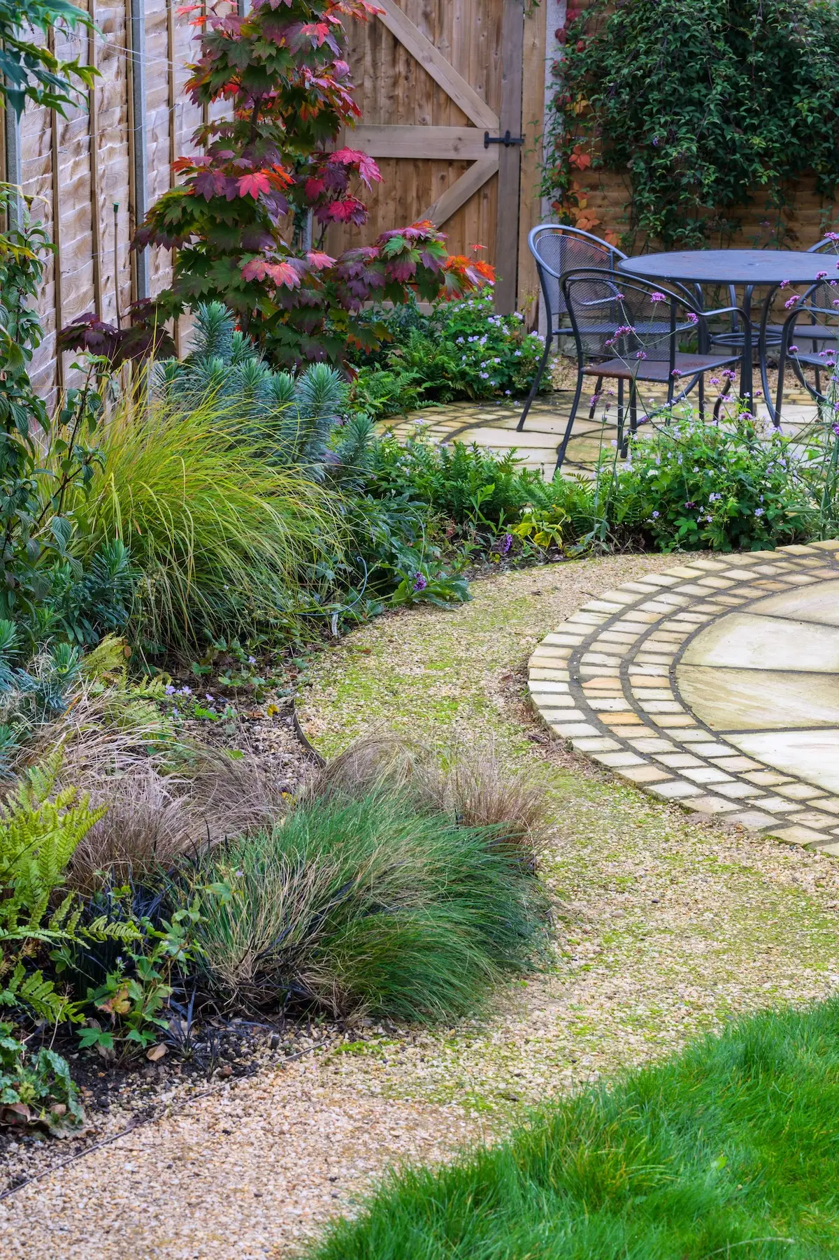 A gently curving pathway weaves gracefully through the garden, connecting the decking area to various seating spaces. This thoughtful design encourages exploration, inviting the client to enjoy the garden’s full potential while enhancing its overall flow and sense of connection.