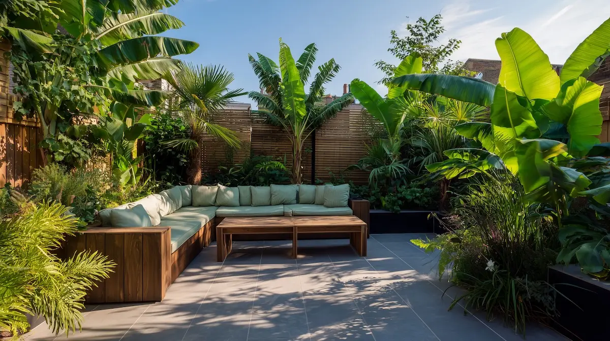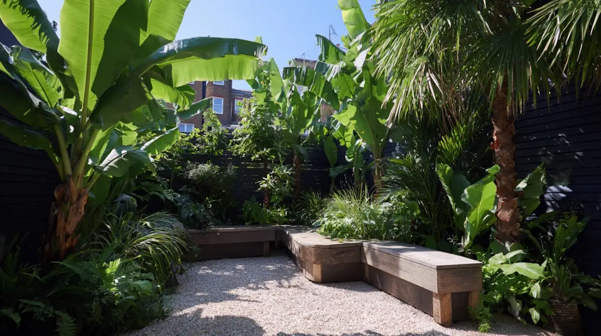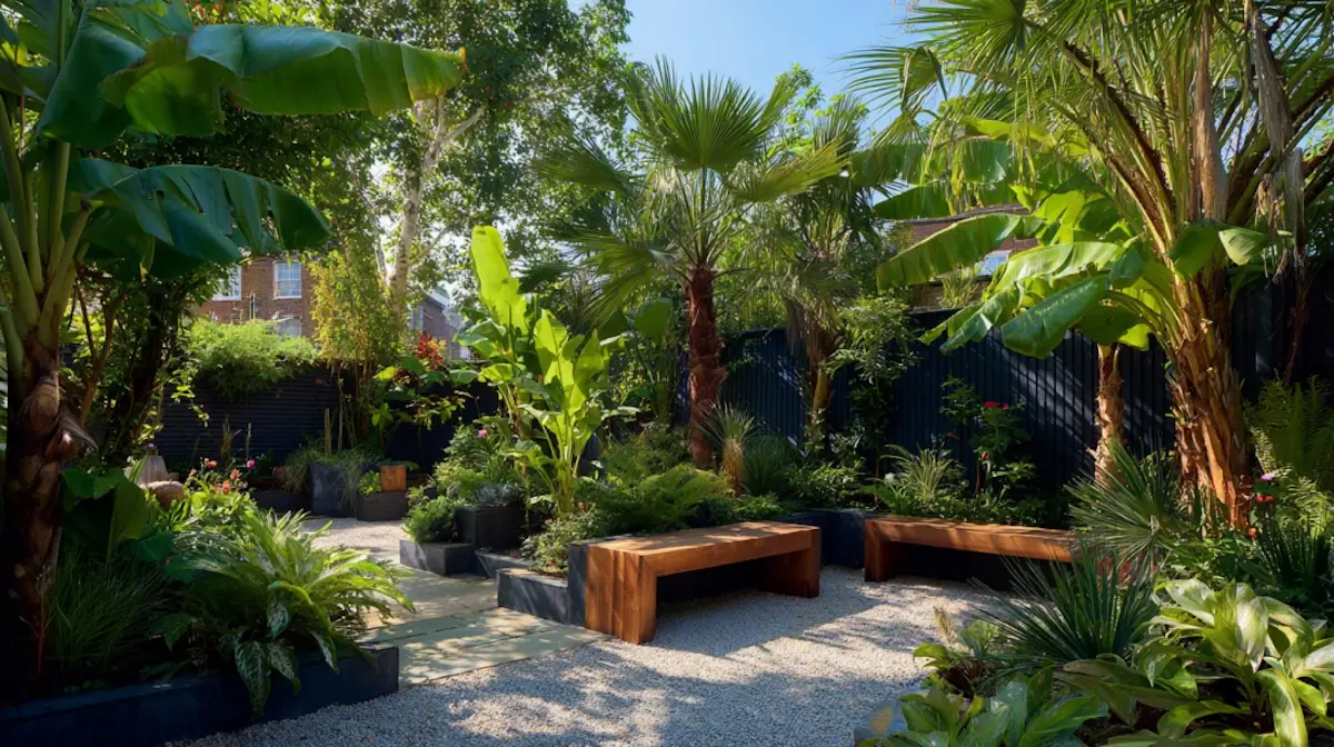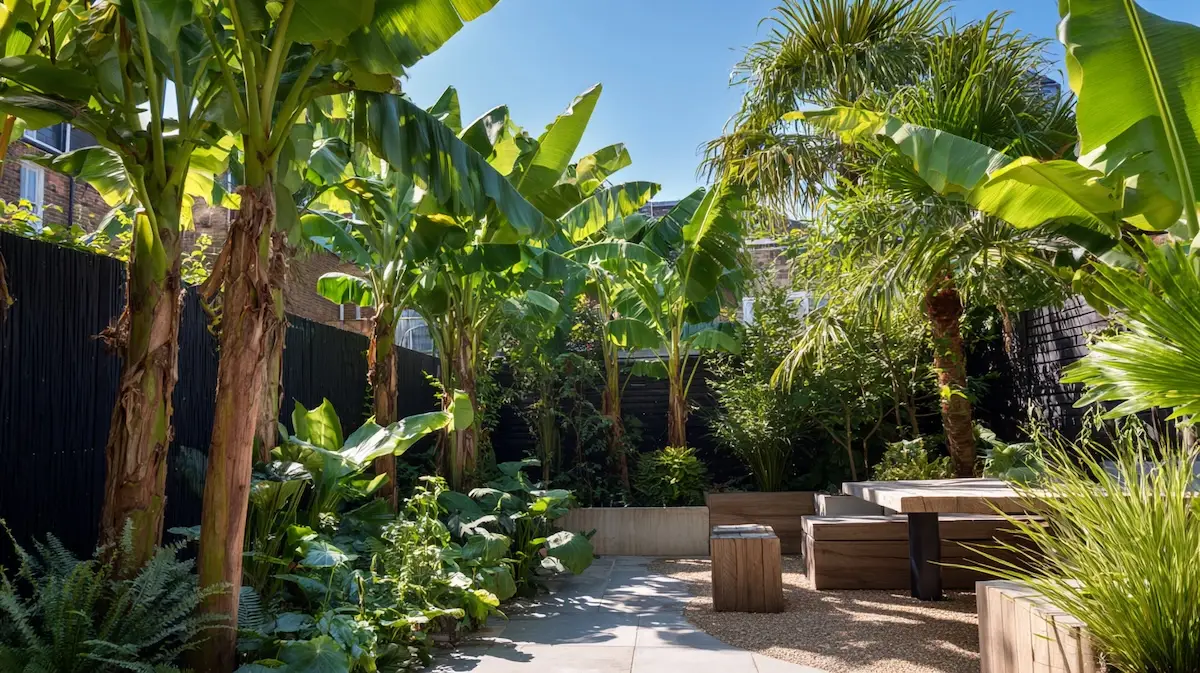 Dark green is the overriding colour for a tropical garden. Add hints of orange, white or red for colour or black bamboo for drama.